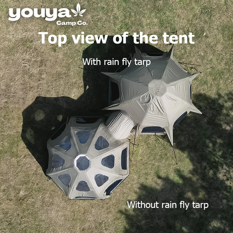 Place the canopy over the tent, tension the wind rope, peg them down, and you’re all set!