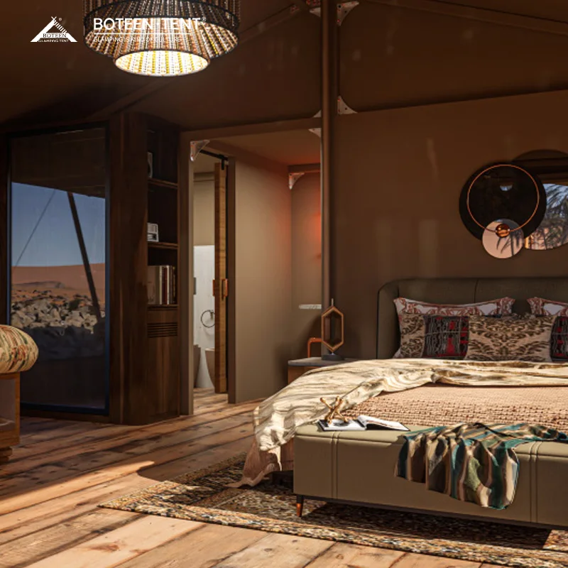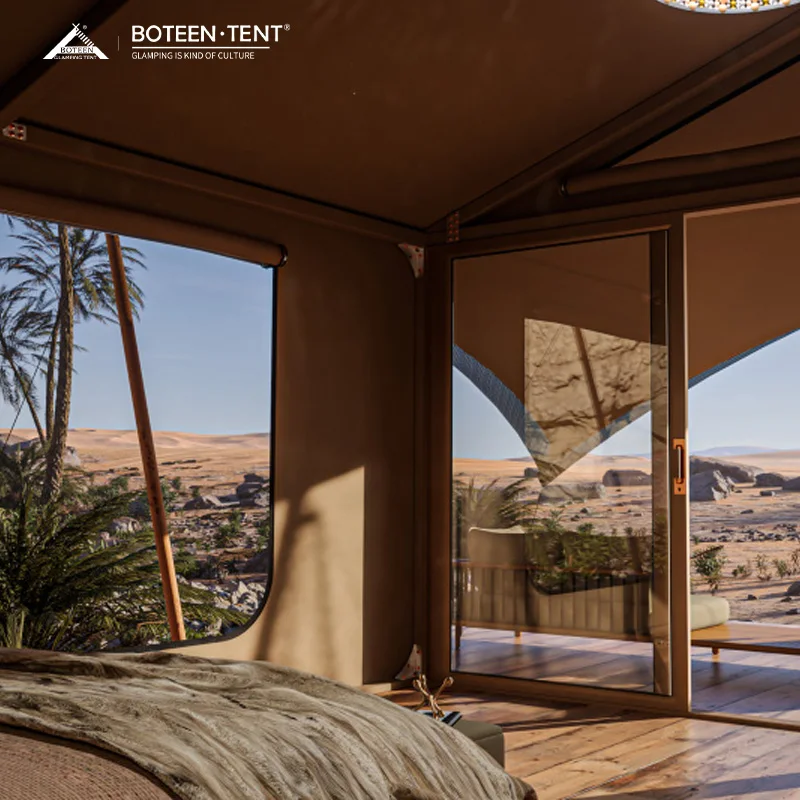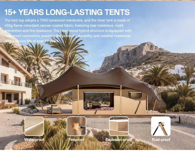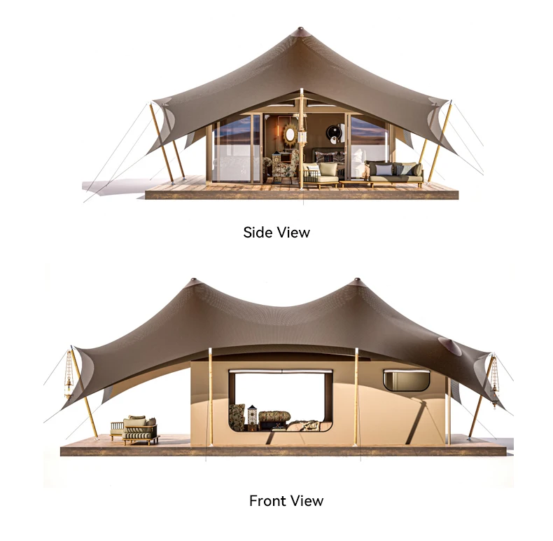 Wooden Outdoor Glamping Tent with Oxford Fabric Four-Season Water Resistant Luxury Safari Desert Hotel & Island Sun Cabin